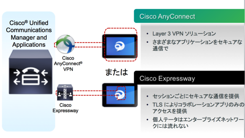 外出先からのネットワーク アクセスという観点からいうと、Cisco AnyConnect と呼ばれる VPN ソリューションも選択肢のひとつです。Cisco AnyConnect を導入すれば、Cisco Jabber だけではなく、イントラネットの Web ページやメールを含めてすべての社内アプリケーションを、社外からでも利用可能になります。Collaboration Edge は、Cisco Jabber の機能のみを社外から 利用したいという要望に答えるために開発されました。