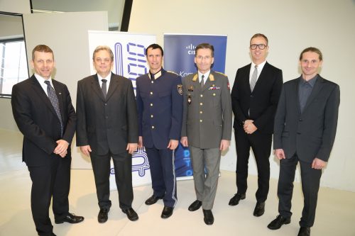 1: Sprecher v.l.n.r.: Mag. Christian Fugina, Cisco Adriatics Leiter öffentlicher Sektor; Chefinspektor Robert Marban vom Landeskriminalamt Burgenland; Landespolizeidirektor Burgenland Mag. Martin Huber; Brigadier Ing. Mag. Hermann Kaponig, Kommandant „Kommando Führungsunterstützung & Cyber Defence“ & Cyber Koordinator des BMLVS; Lothar Renner, Cisco Sales Director Cyber Security Mittel- und Osteuropa; Christian Dick, Bit Studio Geschäftsführer