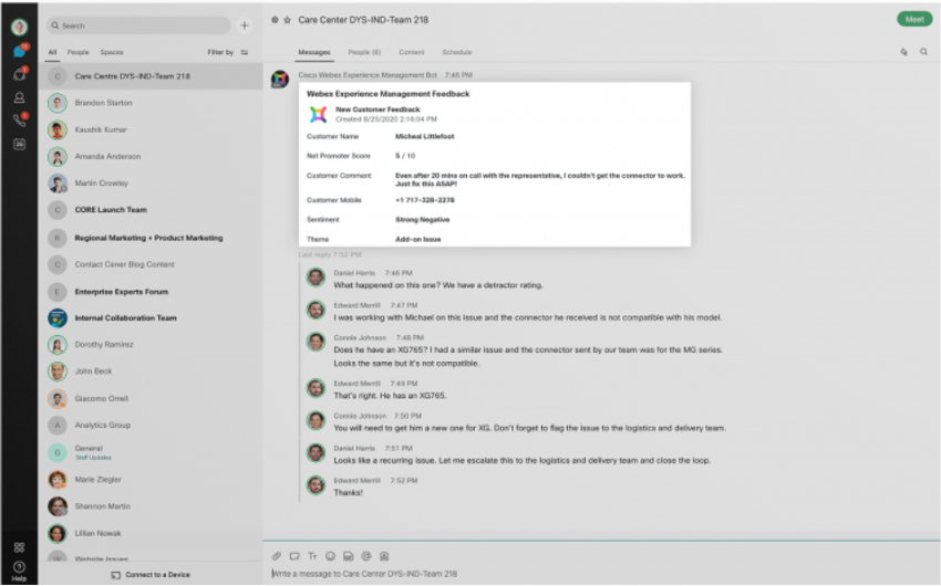 Mantenha as experiências do cliente no topo da mente. Nossa solução de Gerenciamento de Experiência Webex webex alimentada por IA/ML baseada em nuvem se integra com equipes da Webex para melhorar a colaboração dentro da empresa. Por exemplo, ser alertado automaticamente de uma revisão ruim para que você possa resolver proativamente o problema e “fechar o loop” com o cliente. Resultado? A insatisfação que muitas vezes prejudica os KPIs como CSAT e NPS é evitada, a receita pode ser aumentada e o valor da vida do cliente melhorado.
