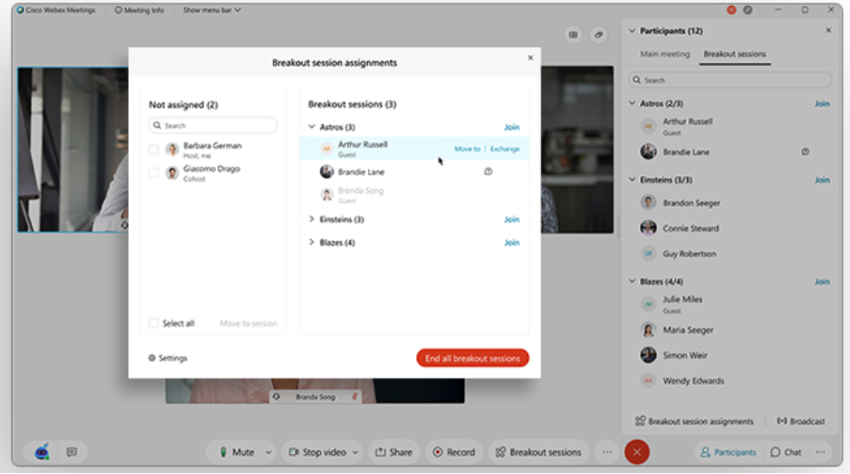 Salas de fuga em Reuniões Webex. Desde sessões de planejamento até treinamentos, as fugas permitem discussões mais focadas. Predefinidos ou criados em tempo real, as equipes podem se encontrar cara a cara, compartilhar conteúdo e se mover facilmente entre as sessões, conforme necessário. Temporizadores e mensagens de transmissão ajudam as coisas a se moverem suavemente – talvez até melhor do que a última oficina que você organizou no escritório!