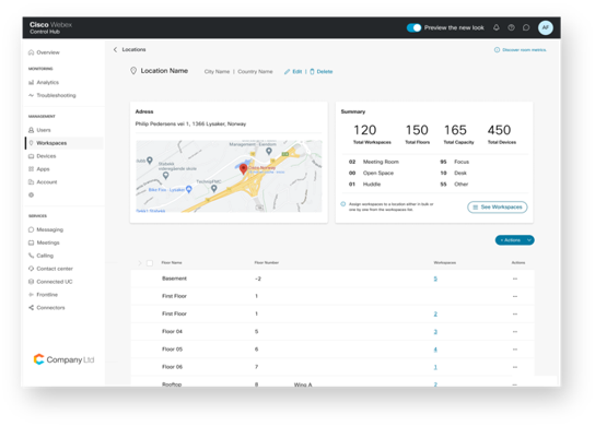 Gerenciar recursos colaborativos em um modelo de trabalho híbrido pode se beneficiar de dados rápidos, fáceis e simples. Com resumos de localização do espaço de trabalho e plano de piso, você pode visualizar sua área de trabalho tanto geograficamente quanto localmente no Webex Control Hub.