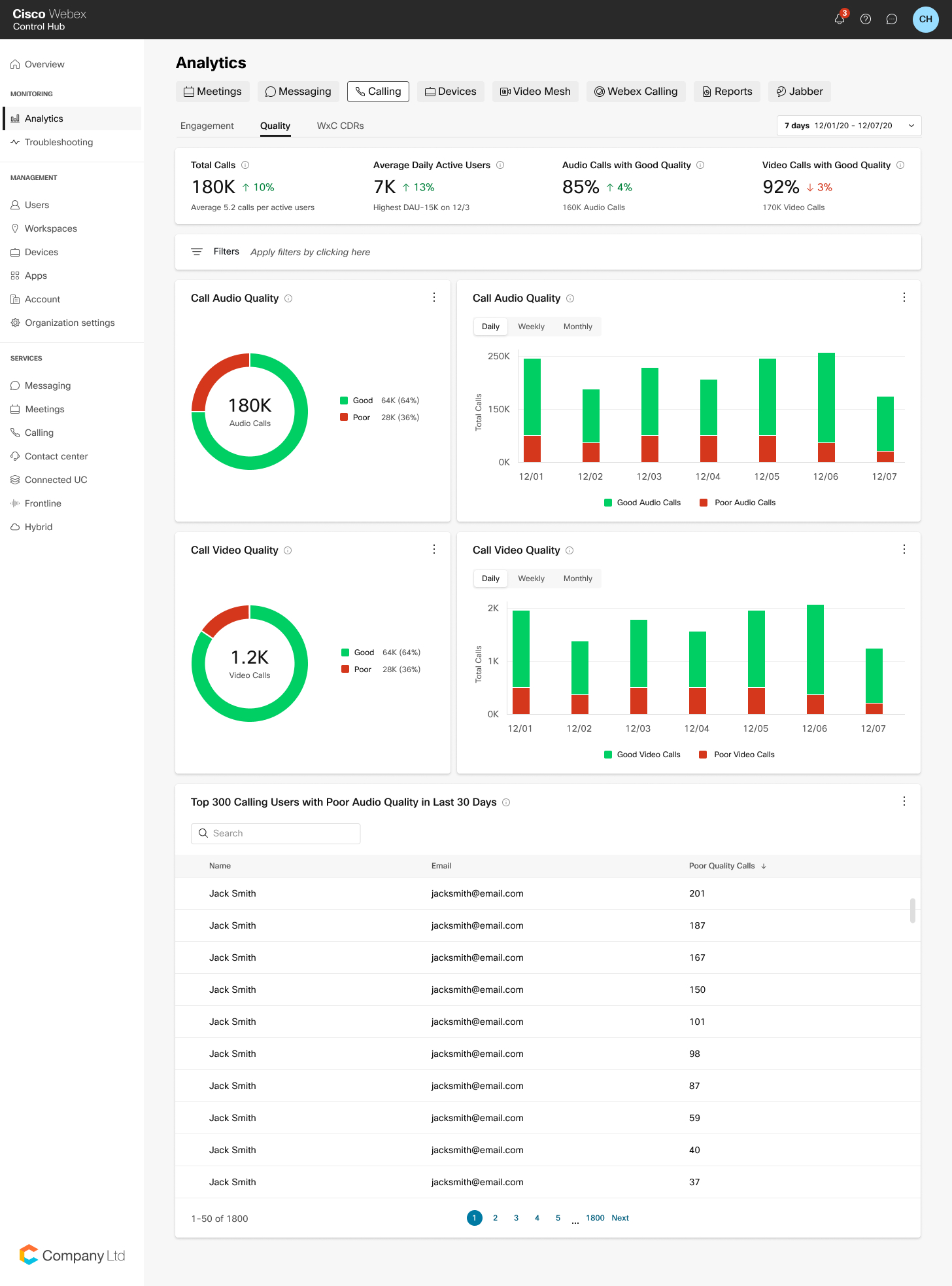 Em abril, o Webex Control Hub incluirá análises em tempo real para mensageria e chamadas estendendo a função para todo a suite de serviços.
