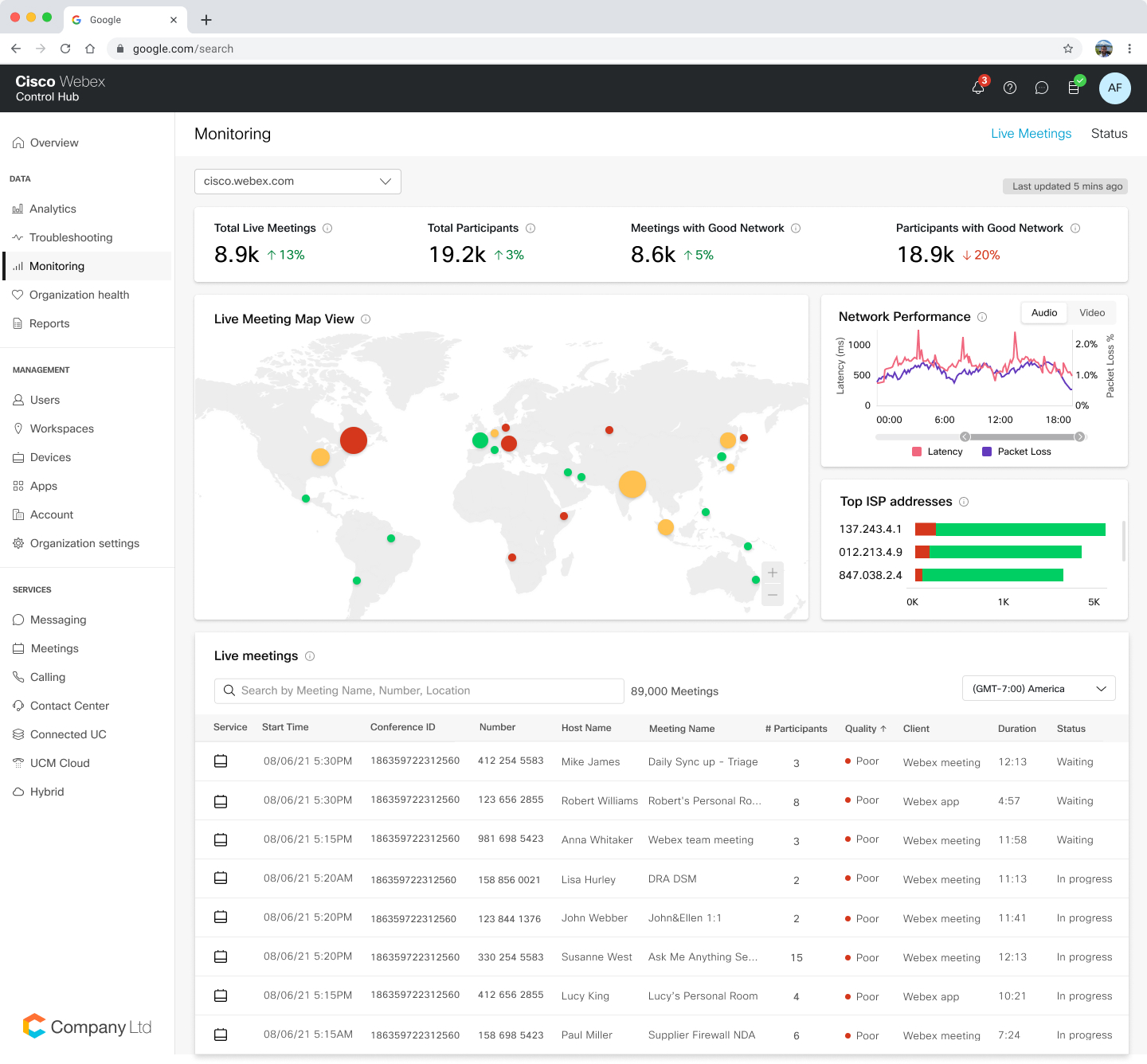 O Webex Control Hub apresentará uma visão geográfica que mostra todas as reuniões ao vivo e data centers conectados. Com esta ferramenta visual, o administrador de TI pode facilmente identificar reuniões ao vivo com um potencial problema de qualidade da rede e usar ferramentas avançadas de solução de problemas para abordar proativamente.