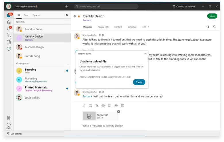 Aplique limites de tamanho para arquivos carregados em espaços Webex para cumprir as diretrizes de conformidade. O Webex Control Hub permite que as organizações configurem o limite de tamanho do arquivo que suas ferramentas subsequentes de conformidade de terceiros usadas para arquivar dados corporativos podem suportar.