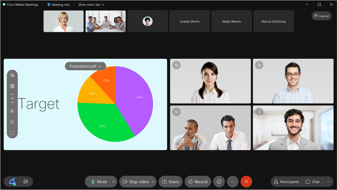 Personalize sua visão no Webex para que você possa se concentrar nas pessoas que deseja ver. Dois novos recursos de design no Webex permitem personalizar sua visão e experiência: use recursos de zoom e saída para ajustar sua visão de grade de 5×5 a 2×2, ou como preferir,para que se concentrar nas pessoas que você quer ver. Você pode simplesmente usar o controle deslizante no canto superior direito e ampliar para ver imagens maiores ou ampliar e ver o maior número de pessoas possível.