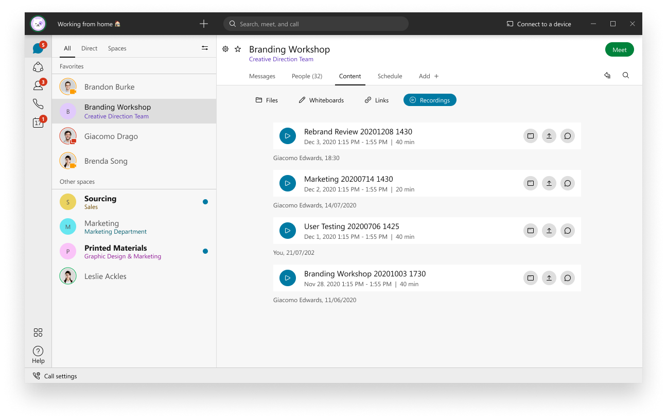 No espaço que você configurou para o seu encontro, sua gravação estará acessível na nova guia “Gravações” na guia “Conteúdo”.
