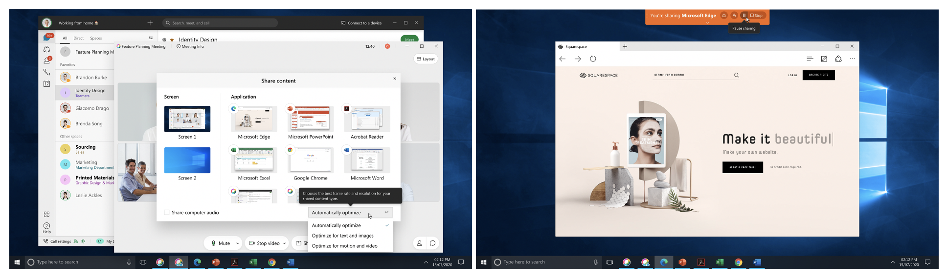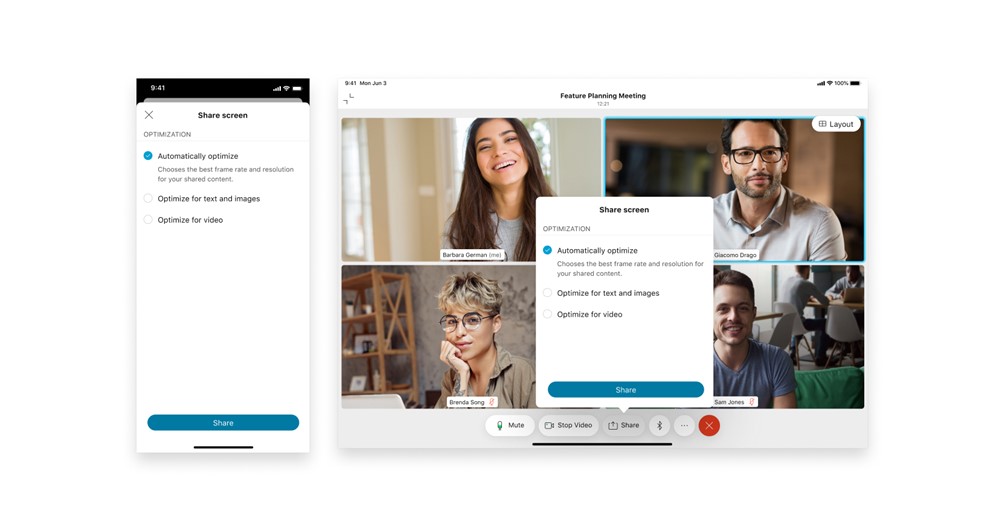 O Webex otimiza automaticamente seu conteúdo compartilhado para texto, imagem ou vídeo para uma melhor experiência. Quando você compartilha um vídeo, você não precisa mais selecionar a menor qualidade para compartilhar. O Webex determina automaticamente configurações otimizadas selecionando a melhor velocidade e resolução para o seu tipo de conteúdo.