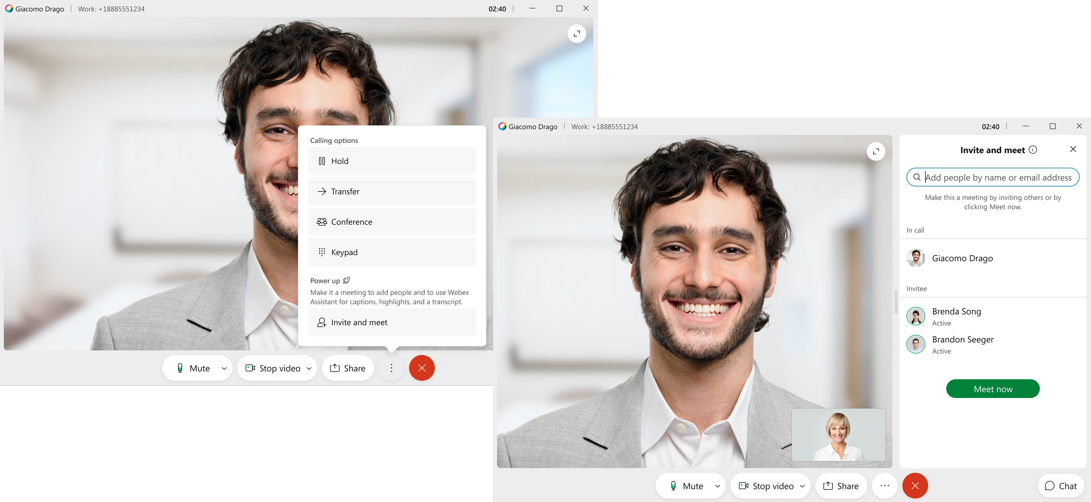 O Webex permite a colaboração contínua a partir de uma simples chamada telefônica. Se você estiver em uma chamada, agora você pode aumentar a chamada para uma reunião completa com alguns cliques de teclado sem ninguém esperar. Convide mais participantes para participar do debate. Eles receberão uma notificação para participar da reunião e, a partir daí, todos os participantes poderão aproveitar transcrições de IA, traduções em tempo real, notas e itens de ação e gravações. Você pode até mesmo mover chamadas para uma reunião quando você está falando com pessoas fora de sua organização. Disponível no Unified Communication Manager em abril e em breve para Webex Calling.