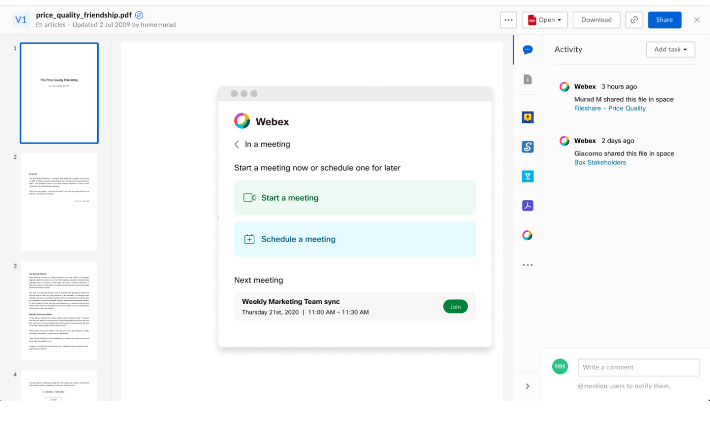Precisa colaborar ao vivo em um documento da Box? Inicie ou agende uma reunião do Webex ou compartilhe conteúdo em um espaço Webex, sem sair da Box. A nova integração do Webex com Box permite a comunicação presencial e o compartilhamento fácil de conteúdo, para que você possa se concentrar em fazer seu trabalho mais rápido. Verifique com seu administrador de TI o Box se você não ve “Compartilhar arquivo com Webex” em sua conta da Box. (Disponível para Windows e Mac)