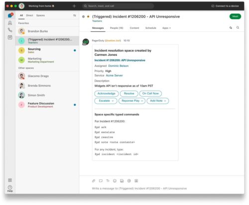 Classifique rapidamente os incidentes críticos para os negócios com sua equipe no Webex por meio do bot PagerDuty. Desbloqueie a capacidade de criar, reconhecer e resolver incidentes do PagerDuty diretamente em um espaço. Ele pode gerar automaticamente um espaço de incidente focado para garantir que todos permaneçam atualizados com o status e o andamento dos incidentes.