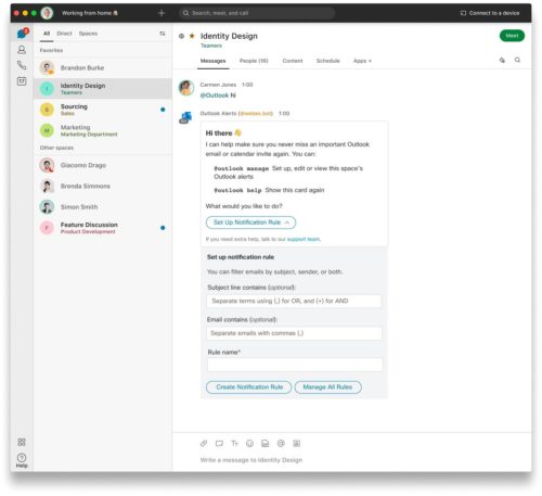 Fique atento à sua caixa de entrada com notificações no Webex do Outlook Alert Bot para Microsoft Office 365. Com esta atualização, você poderá receber notificações de e-mails importantes e convites de calendário do Outlook. Você pode configurar regras para receber e-mails no Webex, talvez e-mails de um cliente específico ou e-mails com um determinado tópico. Crie um espaço Webex para cada cliente onde você e sua equipe possam se concentrar em responder a eles. O Outlook Alert Bot faz tudo! Confira aqui.