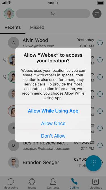 Os usuários compartilham automaticamente sua localização em caso de emergência. Os administradores de TI podem habilitar o monitoramento de localização para usuários e seus serviços de emergência do Webex (por exemplo, 911). A localização da chamada é compartilhada automaticamente com os serviços de emergência. Compatível com aplicativos de usuário em Windows, Mac, iPhone, iPad e Android.
