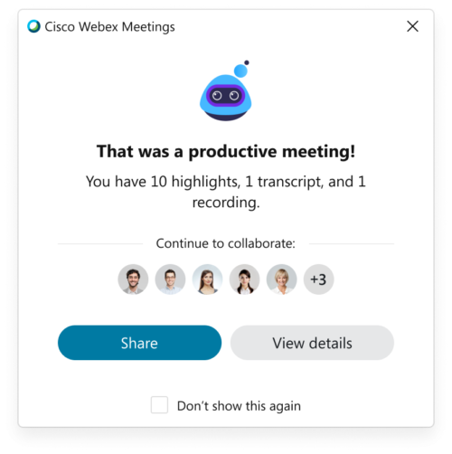Utilizando o Webex Assistant, ao final da reunião aparecerá uma janela pop-up apenas para o organizador com todas as informações importantes que foram visualizadas na reunião, desde o resumo, aspectos importantes, transcrições e gravações. O organizador tem a opção de compartilhar imediatamente as informações com os participantes da reunião com um único clique ou visualizar mais detalhes da reunião.