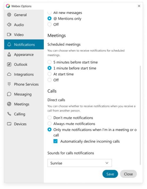 Defina preferências para silenciar ou rejeitar notificações quando você estiver em uma reunião.