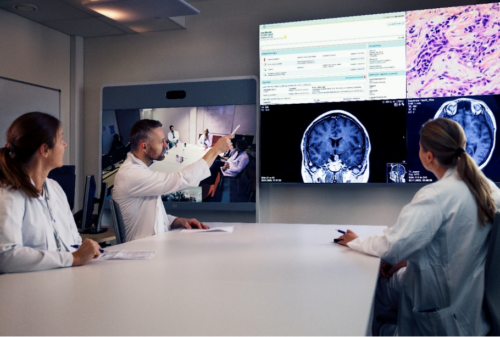 Exiba conteúdo de até quatro fontes diferentes em suas reuniões com esta solução poderosa com Webex Room Kit Pro e Cisco Meeting Server. Perfeito para conectar remotamente especialistas que precisam tomar decisões rapidamente, enquanto analisam dados de várias fontes. Por exemplo, a solução de múltiplos conteúdos da Webex para saúde está ajudando fornecedores especializados a reduzir o tempo para diagnosticar câncer remotamente, melhorar os resultados dos pacientes e reduzir o estresse e a incerteza para as famílias.