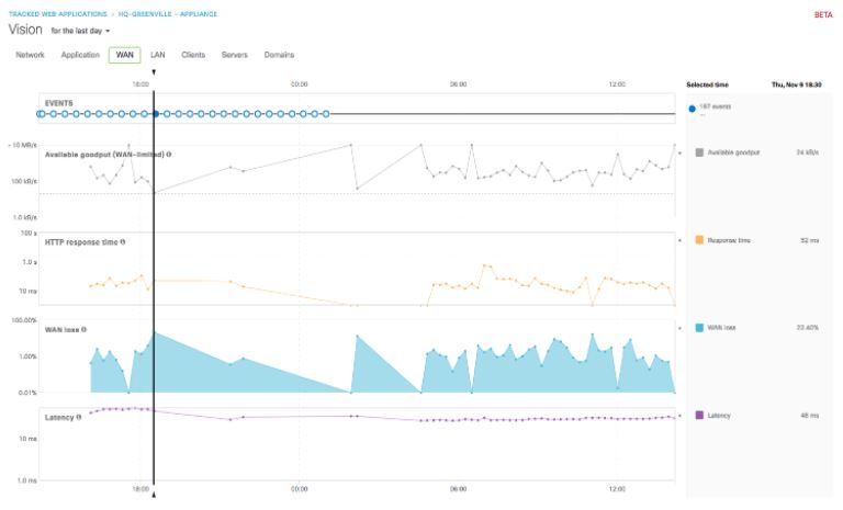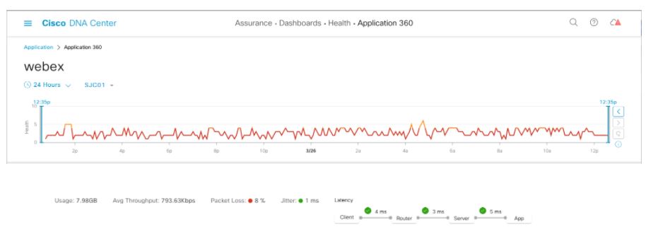 Esse outro exemplo pode-se observar também que se trata de uma perda de pacotes que vem acontecendo de tempos em tempos, relacionado a uma determinada aplicação, não necessariamente um problema na rede ou na conectividade WAN. Com esse tipo de visibilidade se pode novamente descartar um problema da infraestrutura WLAN.