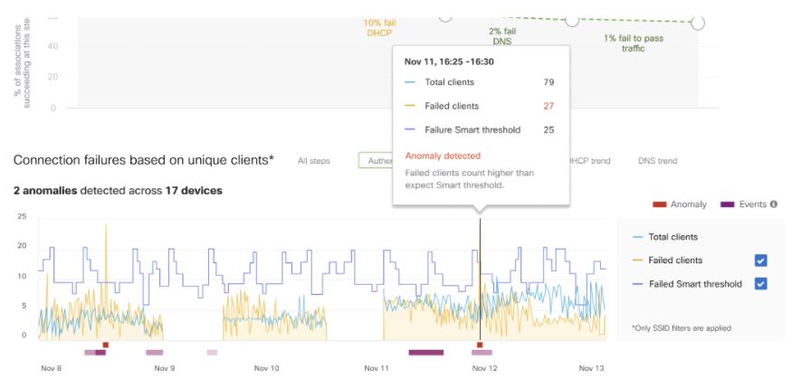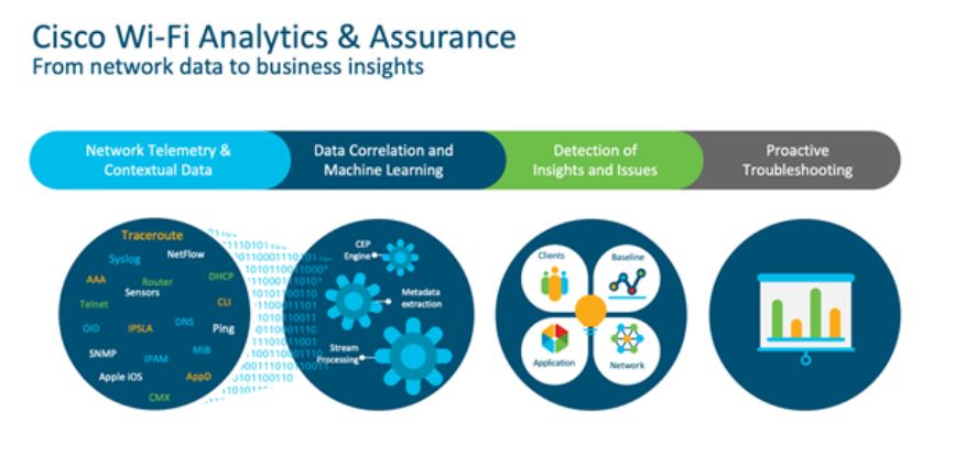 A boa notícia é que em sistemas Cisco com gerenciamento Cloud, como o Cisco Meraki ou em sistemas de gerenciamento tradicionais como Cisco DNA Center, os elementos de rede são capazes de analisar gigantescos volumes de dados e enviar de forma eficiente o que chamamos de telemetria da rede. Essas informações de telemetria são também extraídas de outras fontes como os serviços de rede e dos próprios clientes Wi-Fi. Depois da coleta, essas informações são processadas e correlacionadas de forma a gerar um entendimento completo do que está acontecendo na rede. Dessa forma o administrador já começa a sua análise com um contexto completo e não mais dados isolados em diferentes ferramentas, como acontecia anteriormente.