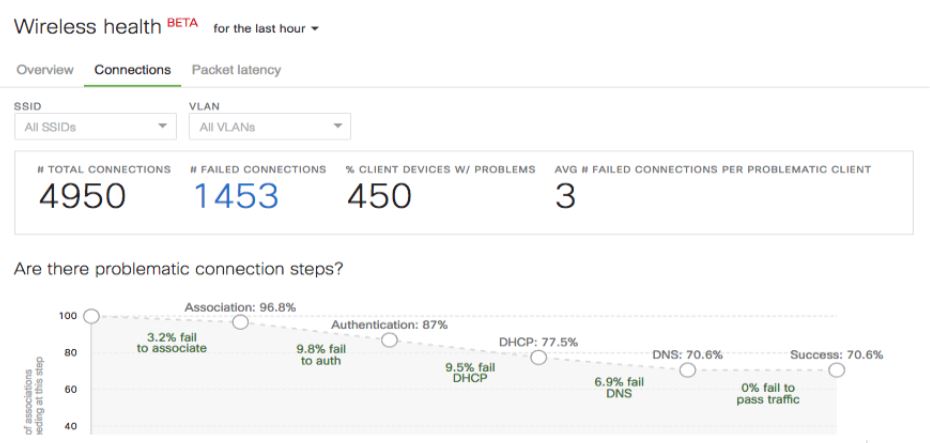 Felizmente as soluções Cisco dispõem de dashboards com os indicadores mais importante para esse entendimento como apresentado abaixo. Eles indicam desde a distribuição de clientes em diferentes faixas de nível de sinal e sinal ruído, métricas sobre o tempo de roaming – transição entre Access Points, bem como qual a quantidade de clientes atendidos pelas diferentes gerações de Wi-Fi e diferença de performance se comparado com gerações anteriores da tecnologia.