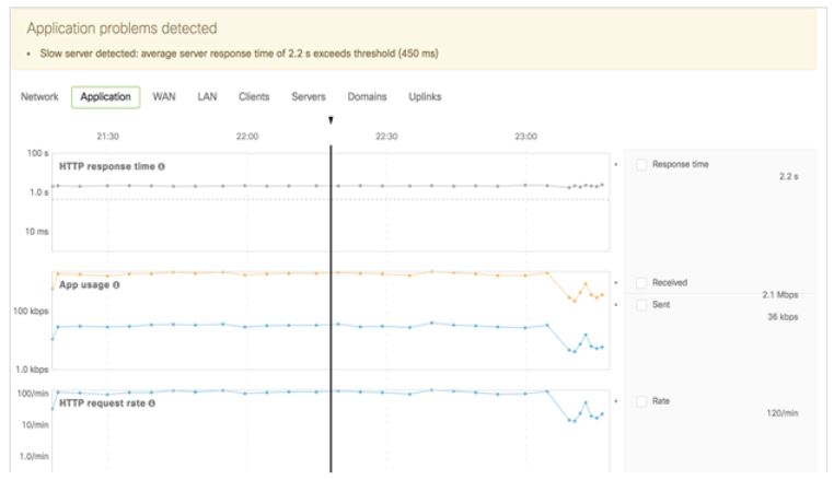 Nesse primeiro exemplo podemos visualizar que aconteceu uma degradação no link WAN e com isso a aplicação também foi afetada. O usuário final somente irá reportar que ficou ruim e a primeira suspeita é que algo na rede WLAN aconteceu.