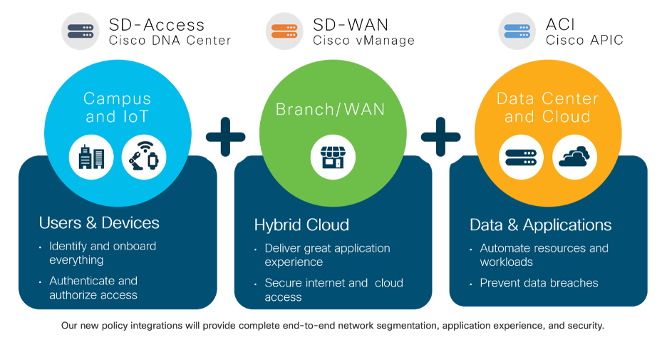 A Cisco está trabalhando para permitir a cooperação entre diferentes domínios de rede, compartilhando elementos distintos de suas políticas de ponta a ponta e integrando os domínios de campus, WAN, data center e nuvem.