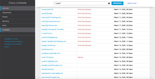 (Captura do Cisco Umbrella listando novos domínios que incluem a palavra “COVID” neles)
