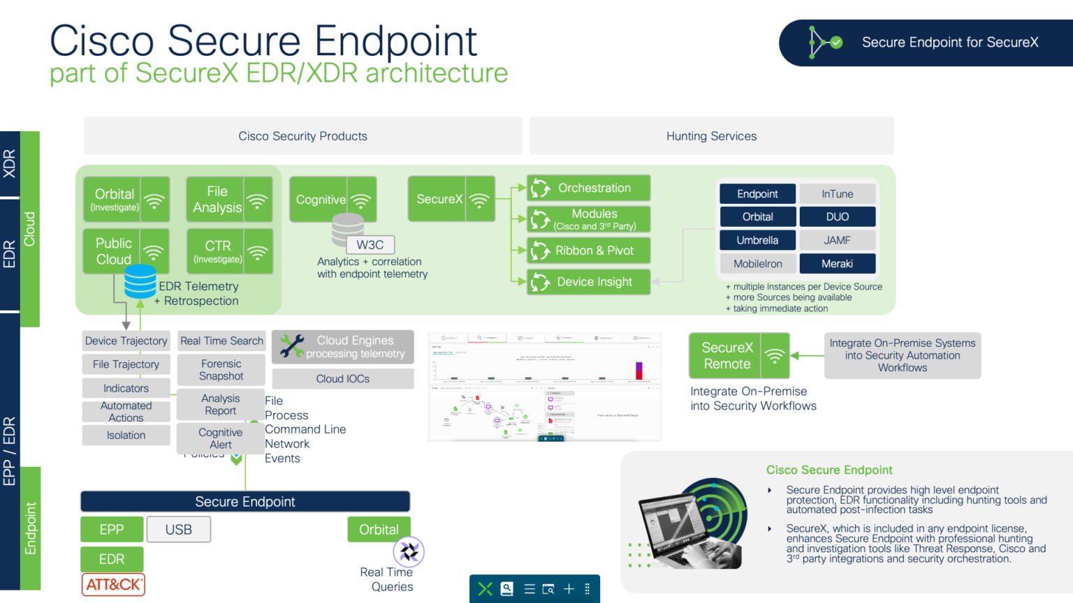 As organizações precisam mudar para uma abordagem mais dinâmica e proativa para fortalecer suas defesas contra adversários que estão constantemente mudando e avançando em suas formas de ataque. Existem elementos-chave que podem ajudar a detectar esse comportamento malicioso: o Cisco Secure Endpoint, (anteriormente conhecido como AMP for Endpoints), é uma solução de próxima geração de antimalware, que reúne característica de soluções EPP e EDR, que pode detectar comportamentos inesperados e não somente enviar alertas em tempo de execução, mas impor mecanismos de respostas para isolar um endpoint infectado, para que este não se torne um vetor interno de comprometimento e ponto inicial de movimentação lateral, reduzindo drasticamente o eventual escopo de um ataque.