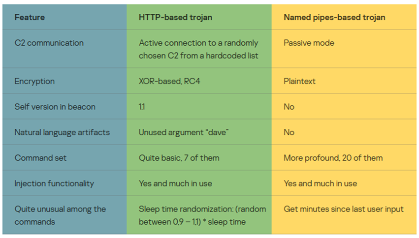 O payload final é um conjunto de trojans que empregam dois mecanismos de comunicação diferentes – HTTP com criptografia RC4 e não criptografado com pipes nomeados (FIFO) – que permitem executar comandos arbitrários, baixar arquivos de uma URL, escalar privilégios e fazer capturas de tela. Os pipes nomeados são tecnicamente capazes de se comunicar com qualquer host externo visível da rede, mas no Windows os pipes nomeados são construídos sobre o protocolo SMB, que dificilmente abriria para redes externas. Portanto, esses módulos provavelmente servem para movimentação lateral.