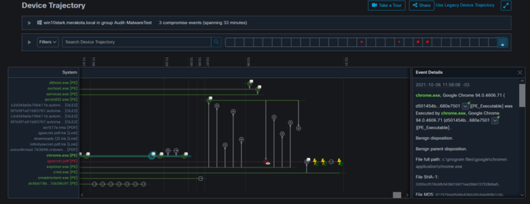 O Cisco Secure Endpoint interrompe possíveis ataques sem arquivo antes mesmo de começar. Ele fornece aos administradores uma visibilidade inigualável da trajetória de uma ameaça, permitindo que você rastreie facilmente a propagação de malware e fique à frente da caça.