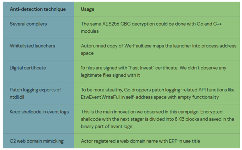 Também é notável o uso de invólucros antidetecção como parte do conjunto de ferramentas, sugerindo uma tentativa por parte dos operadores de passar despercebido por análises automatizadas e até mesmo manuais. Um dos principais métodos é manter o shellcode criptografado contendo o malware do próximo estágio em artefatos de 8 KB em logs de eventos — uma técnica nunca vista em ataques no mundo real — sendo então combinada e executada.