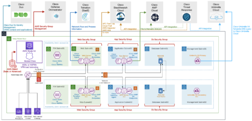 A Cisco recomenda proteger a carga de trabalho e o aplicativo na AWS usando um Cisco Validated Design (CVD) mostrado na Figura 3. Todos os componentes mencionados neste design foram verificados e testados na nuvem da AWS. Esse design reúne os controles de segurança da Cisco e da AWS para fornecer visibilidade, segmentação e proteção contra ameaças.