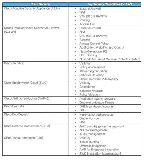 - Firewall virtual de última geração da Cisco (NGFWv): o Cisco NGFWv oferece recursos como firewall stateful, “visibilidade e controle de aplicativos”, IPS de próxima geração, filtragem de URL e AMP de rede na AWS.