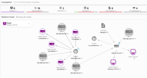Os gráficos configuráveis e fáceis de ler mapeiam os destinos que se comunicaram com o domínio mal-intencionado que você está investigando.
