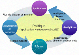 Un point important à garder en tête est que la technologie SDN a été prévue à titre de « cycle de vie » et non uniquement en tant qu’outil de configuration. L’objectif est que les applications acheminent de l’intention en plus de recevoir de l’information, comme on peut le voir dans ce diagramme de cycle de vie.
