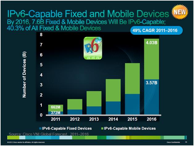 According to the latest Cisco Visual Networking Index (VNI) Forecast, 40.3% of all fixed and mobile devices (or 7.6 billion devices) are expected to be IPv6-compatible by 2016. This represents an increase from 10% of all devices in 2011.