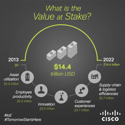 “I believe that businesses and industries that quickly harness the benefits of the Internet of Everything will be rewarded with a larger share of that increased profitability. This will happen at the expense of those that wait or don’t adapt effectively. That’s why the value is “at stake” – it’s truly up for grabs.”