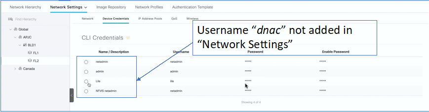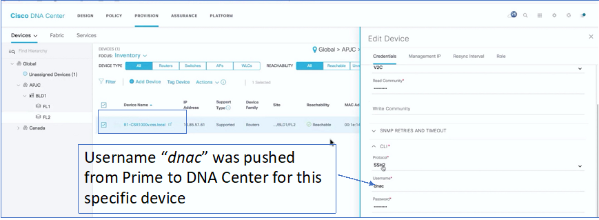 Let’s use this as our example: the devices from our lab that are managed by Prime are using the username “dnac”. We can see in the snapshots below, that such username has been added as credentials for the specific migrated devices. However, when we go to Design > Network Settings > Device Credentials in Network Settings we see that the username has not been added: