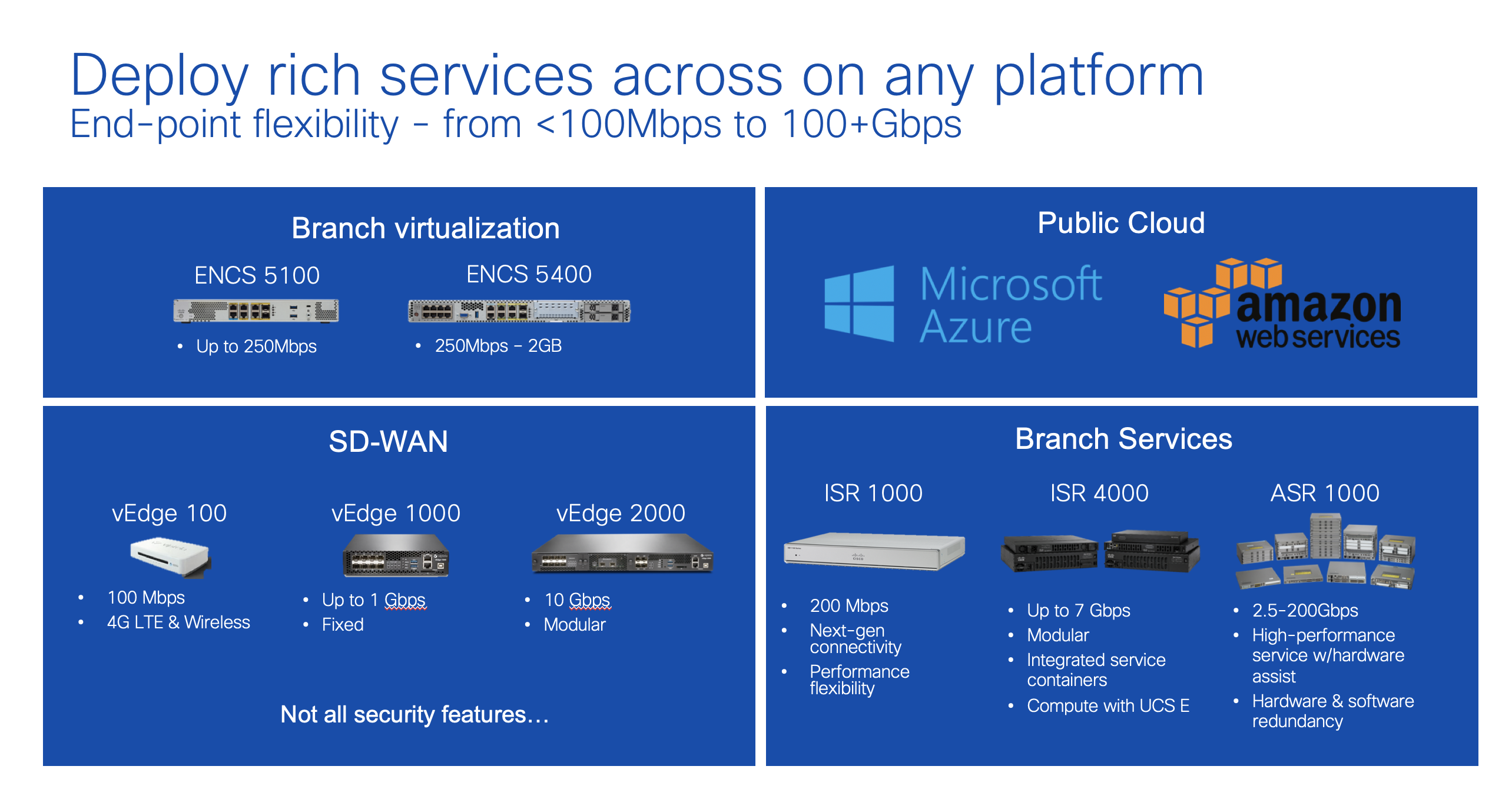 Das Viptela SD-WAN Portfolio baut auf den Viptela vEdge Hardware auf und wird mit den Cisco ISR und ASR Plattformen weitergeführt. Von Vorteil ist damit die grosse Router & Interface Vielfalt sowie die ausgezeichnete Skalierung: