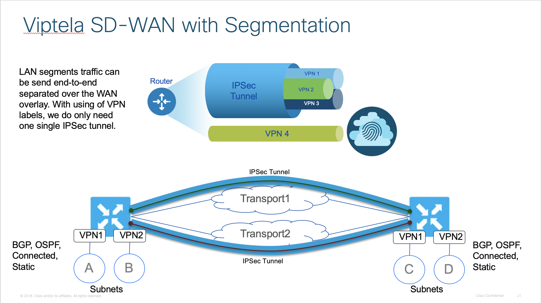 LAN Segmente können mit der Lösung im SD-WAN Overlay getrennt voneinander End-to-End übertragen werden, in diesem Beispiel mit zwei Aussenstellen kann das Subnet A links mit dem Netz C rechts kommunizieren, jedoch A nicht mit D. Das Netz B wiederum kann mit das Netz D, jedoch nicht C kommunizieren, da im Overlay die einzelnen Segmente mittels Label getrennt voneinander transportiert werden. Das Vorgehen ist sehr ähnlich wie bei L3 MPLS-VPNs aufgebaut und vergleichbar.