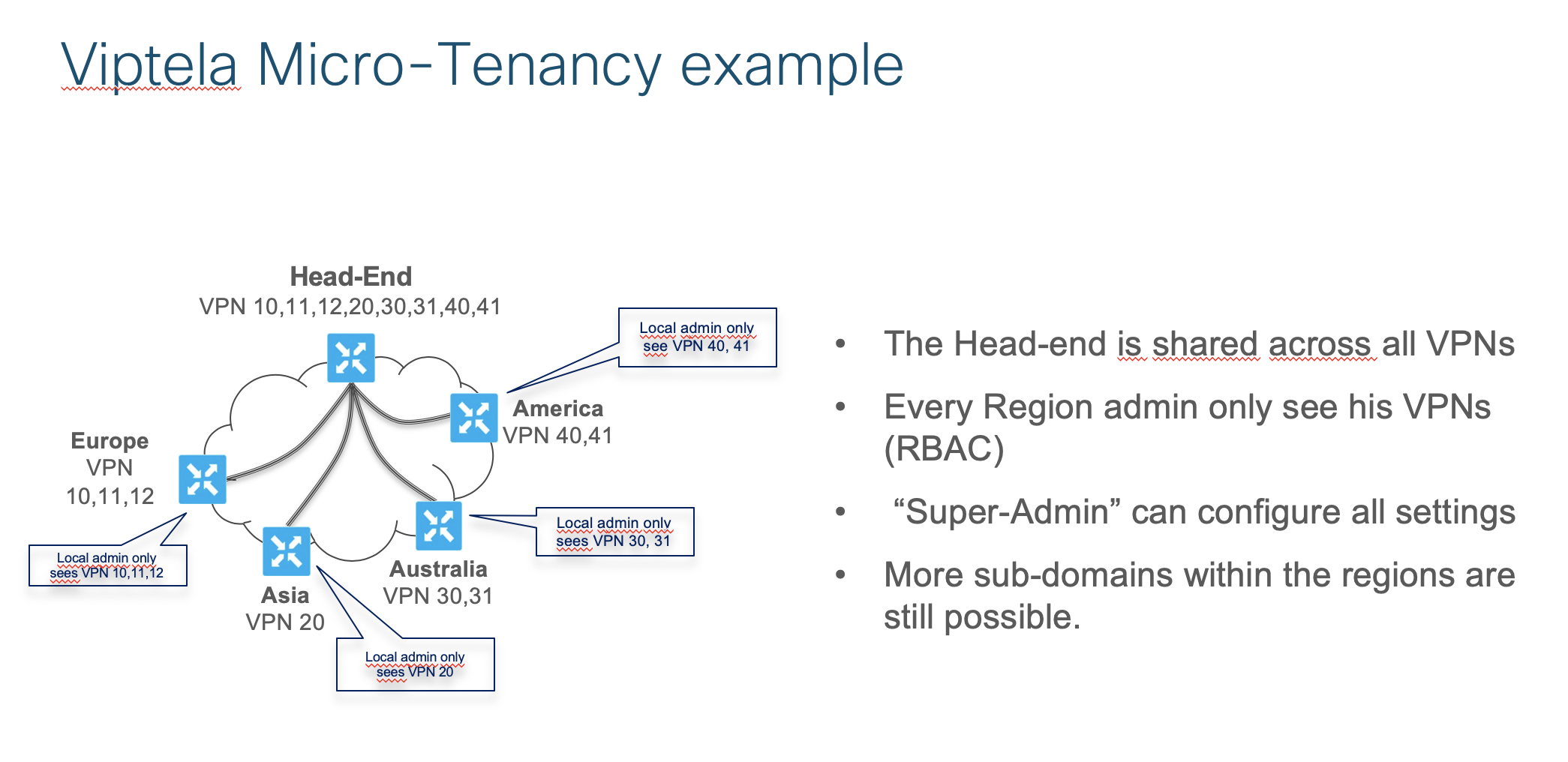Dieses Konzept kann weiter ausgebaut werden, indem die einzelnen VPNs im vManage aus Konfiguration und Monitoring-Sicht mit RBAC Ansätzen voneinander getrennt werden und der Zugriff auf einzelne Admins verteilt wird. Damit ist es möglich, ein “shared Head-End” aufzubauen und dieses mit diversen unterschiedlichen VPNs mit den Aussenstellen zu verbinden. Werden diese VPNs nun mittels RBAC an verschiedenen Admins zugewiesen und entsprechend sinnvoll verteilt, hat man eine Micro-Tenancy Implementierungs-Variante. Jeder lokale Admin sieht nur seinen Einflussbereich und kann auch nur dort Änderungen vornehmen und “seine” Umgebung überwachen.