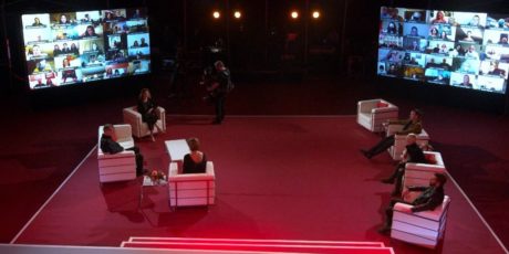 Zwei grosse Videowalls vor der Bühne im Chapiteau des Tourneetheaters DAS ZELT, wo sonst Zuschauerränge für Stimmung sorgen, ein kleines, ungewöhnliches Fernsehstudio war hinter der Bühne, aufgebaut. Die Aufzeichnung der