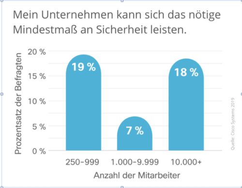 Dabei gibt es je nach Unternehmensgröße noch deutliche Unterschiede: Kleine mittelständische Firmen mit 250 bis 999 Mitarbeitern und Konzerne mit mehr als 10.000 Mitarbeitern schaffen es zu 19% bzw. 18%, das Geld für ein Minimum an Sicherheit aufzubringen; bei Unternehmen mit 1000 bis 9999 Mitarbeitern sind es nur 7%.