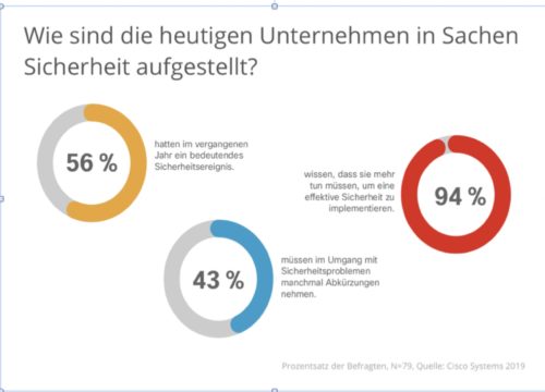 Interessanterweise gaben 56% der Unternehmen an, ein akutes Sicherheitsproblem gehabt zu haben. Bei diesen Fällen mussten 43% radikale Maßnahmen ergreifen, um dem Problem Herr zu werden. Insgesamt gaben 94% Prozent der befragten Sicherheitsverantwortlichen an, dass sie mehr tun müssen, um eine effektive Sicherheit gewährleisten zu können.