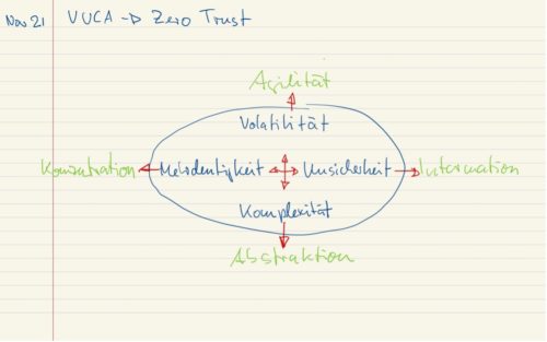 Diese Kombination aus Adaption, Information, Abstraktion und Konzentration oder englisch Adaption, Information, Abstraction und Concentration ergibt dann AICA, das Gegenstück zu VUCA.
