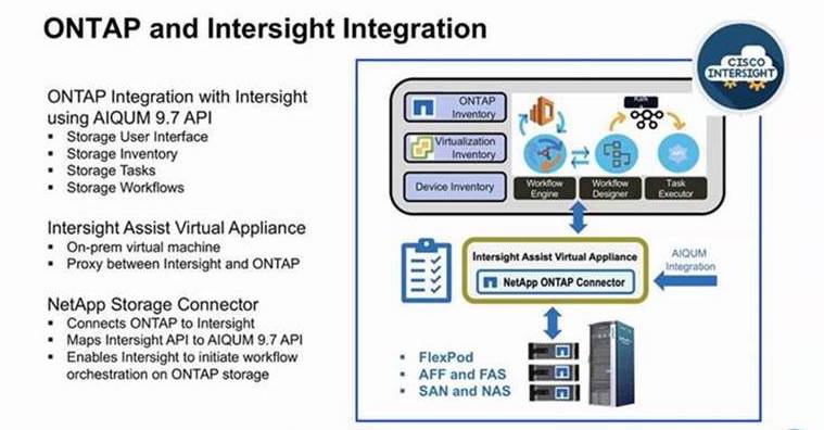 Nachfolgende Aufgaben werden über die Intersight-Plattform möglich sein, wie z.B. die Erstellung und Löschung von FC- und IP-Schnittstellen, SAN/NFS-Volumes und LUNs sowie die Definition von Speicherrichtlinien anzulegen. Entweder benutzerdefinierte oder vordefinierte Workflows, die mit dem integrierten ONTAP-Aufgaben erstellt wurden, könnten in Intersight verwendet werden, um NFS- und SAN-Datenspeicheroperationen für virtuelle Maschinen auszuführen.