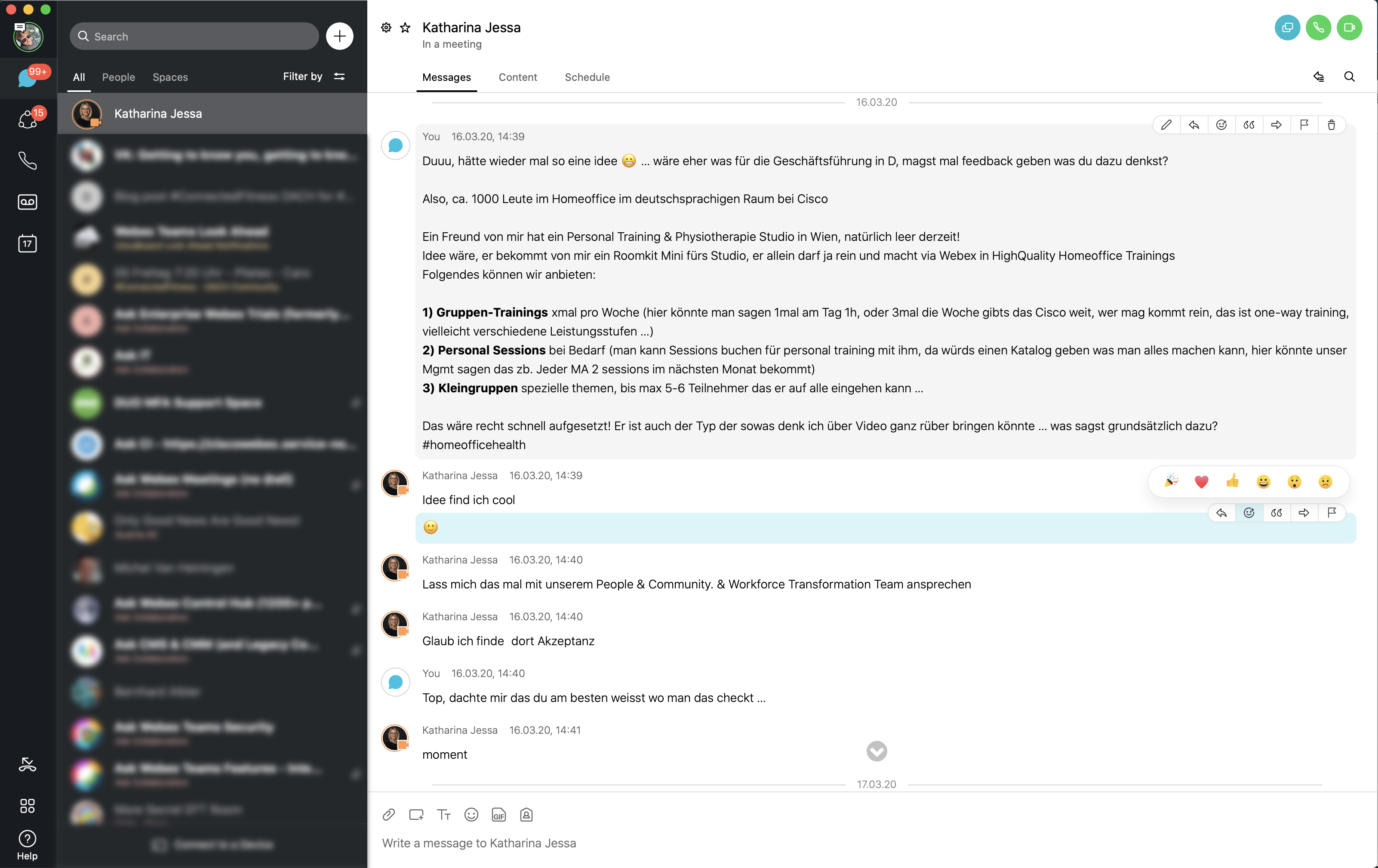 Die Struktur für die Trainings wird flexibel in Webex Teams abgebildet, dort treten Cisco Mitarbeiter einfach einem Bereich bei, wenn Sie an einem Trainings teilnehmen möchten. Im Webex Teams Bereich trifft man sich für das Training und kann auch mit der/dem Trainer/in chatten, Feedback geben, Fragen stellen.