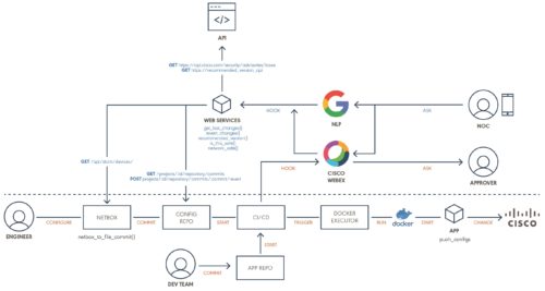 Eingesetzte Technologien: Cisco WebEx Teams, Cisco PSIRT API, Cisco Catalyst 9300 Switch, Google NLP, Gitlab CI/CD Pipeline, Netbox, Docker, Python