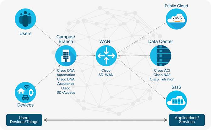 Cisco verfügt über eine komplette Architektur- und Lösungssuite für den Einsatz von Intent-basierten Netzwerken über alle Netzwerkdomänen hinweg. – Campus, Filiale, WAN, Rechenzentrum und Multi-Cloud.