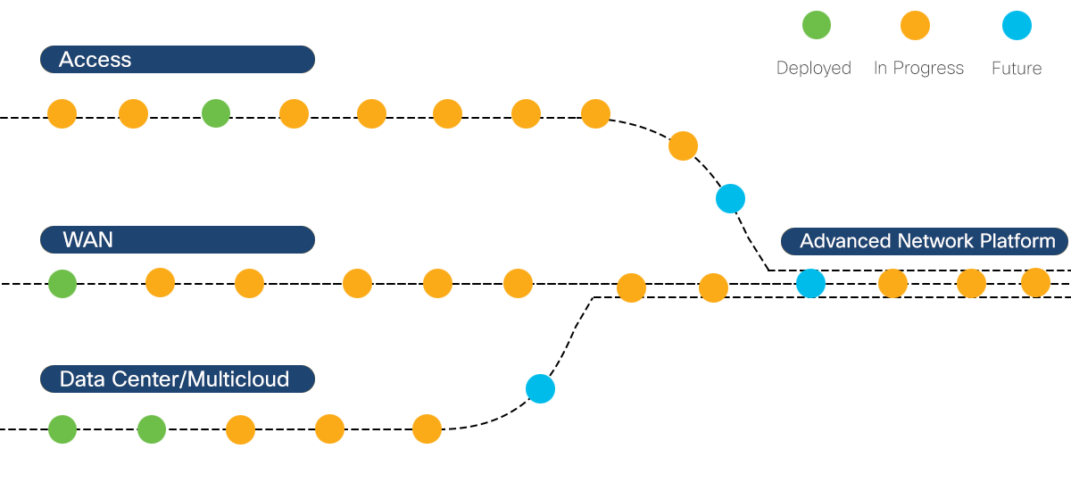 Die Intent-basierten Netzwerklösungen von Cisco erstrecken sich mit Cisco SD-Access über Campus- und Filialnetzwerke, mit Cisco SD-WAN über das WAN und mit Cisco ACI über Rechenzentren und Multi-Cloud-Umgebungen. Programmierbare Schnittstellen erlauben die Integration mit Lösungen von Drittanbietern und die vollständige Interoperabilität mit der Cloud. Einen detaillierten Einblick und hilfreiche Tipps bietet der eigene interaktive Fahrplan von Cisco zur Realisierung eines Intent-basierten Netzwerks.