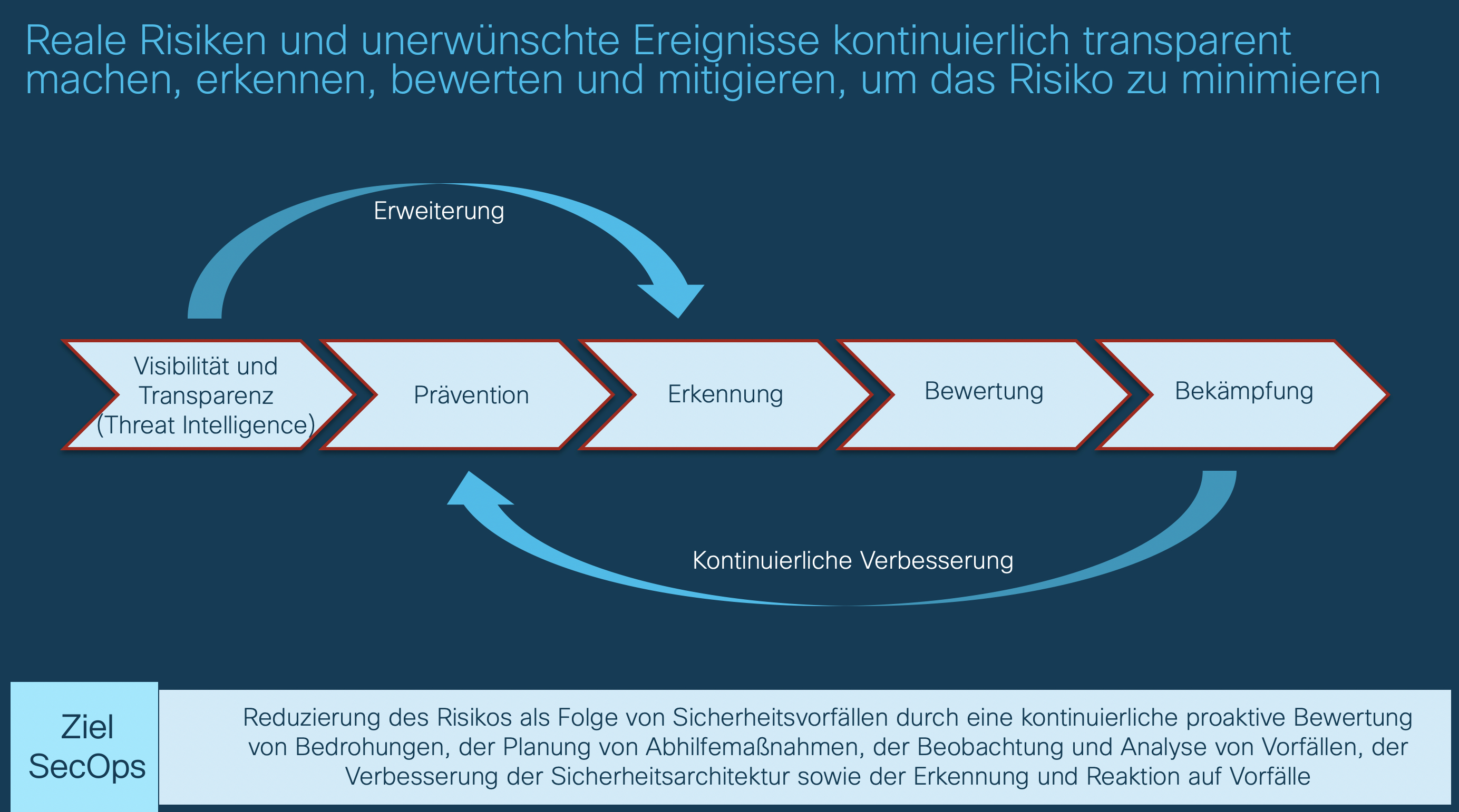 Solche Fähigkeiten der proaktiven Gefahrenerkennung und -abwehr gilt es natürlich nicht nur zur Beantwortung von Anfragen aus der Geschäftsführung zu etablieren. Das übergeordnete Ziel ist es reale Cyberrisiken und unerwünschte Ereignisse kontinuierlich transparent zu machen, zu erkennen, zu bewerten und entsprechend zu reagieren, um das Unternehmensrisiko durch Cybervorfälle zu minimieren. Eine xDR Plattform wie Cisco Secure X liefert dazu die notwendigen technischen Fähigkeiten und reduziert den operativen Aufwand im Vergleich zu herkömmlichen Methoden um ein Vielfaches. Durch die angriffszentrische ganzheitliche Betrachtung gelingt es außerdem eine organisationsübergreifende Zusammenarbeit bei der Bedrohungsabwehr zu etablieren und Erkenntnisse daraus zur kontinuierlichen Verbesserung der Schutzmaßnahmen abzuleiten und umzusetzen.