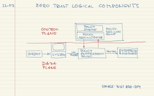 Die Zero Trust Sicherheitsarchitektur ist eine Strategie zur Bewältigung von IT-Sicherheitsherausforderungen in einem organisatorischen Umfeld welches durch Veränderung, Unsicherheit, Komplexität und Mehrdeutigkeit geprägt ist. Die Bewältigungsstrategie Zero Trust baut dafür auf dem Prinzip der minimalen Autorisierung im Zugriff auf Geräte, Netzwerke und Dienste auf. Dazu verwendet es ein logisches Modell bei dem der Zugriff eines Subjektes auf ein Objekt durch einen Kontrolldienst gesteuert wird, der seine Freigabe durch einen Verwaltungsdienst erhält. [Zero Trust Architektur]